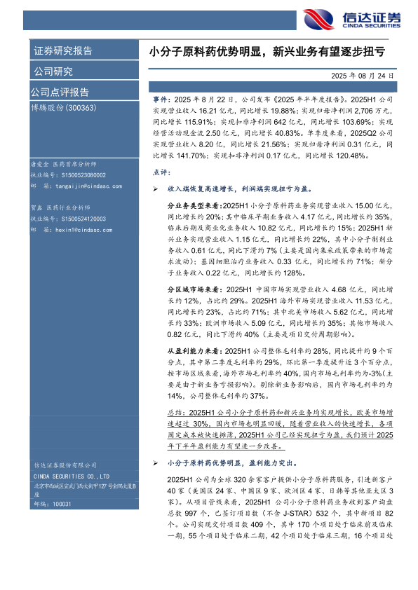 本报告主要分析了博腾股份(300363)2025年半年度报告,核心观点如下: