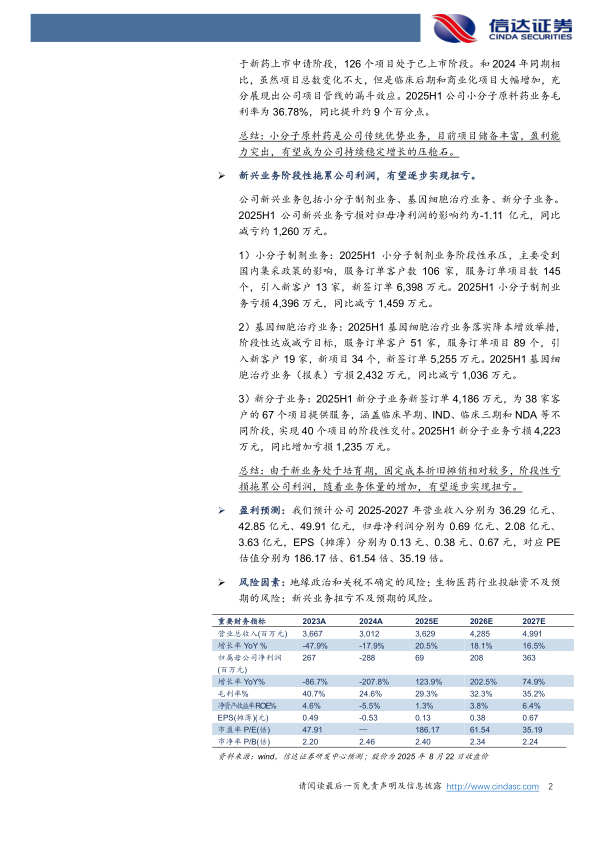 风险因素:地缘政治和关税不确定的风险;生物医药行业投融资不及预期的风险;新兴业务扭亏不及预期的风险。