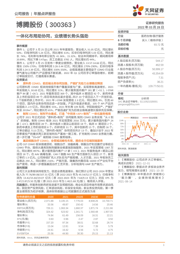 事件 2:公司于 3 月 25 日发布一季度业绩预告:营业收入 13.57-14.66 亿元,同比增长 150%-170%;归母净利润 3.26-3.44 亿元,同比增长 270%-290%;扣非归母净利润 3.24-3.39 亿元,同比增长 330%-350%,业绩高增速主要得益于 CDMO 行业高景气度与公司客户/产品管线不断拓展,2022 年 Q1 公司在手订单强劲增长,前期订单陆续交付,打通高增长赛道。