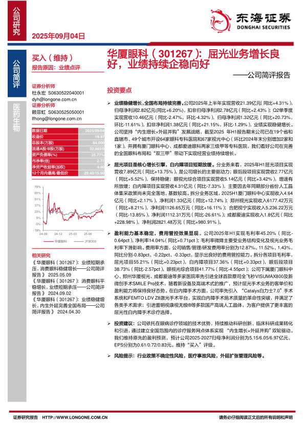 华厦眼科2025年上半年业绩稳健增长,得益于屈光项目的强劲驱动和全国布局的持续完善。公司通过有效的费用管控,保持了盈利能力的稳定。维持“买入”评级,但需关注行业政策、医疗事故及外延扩张管理等风险。