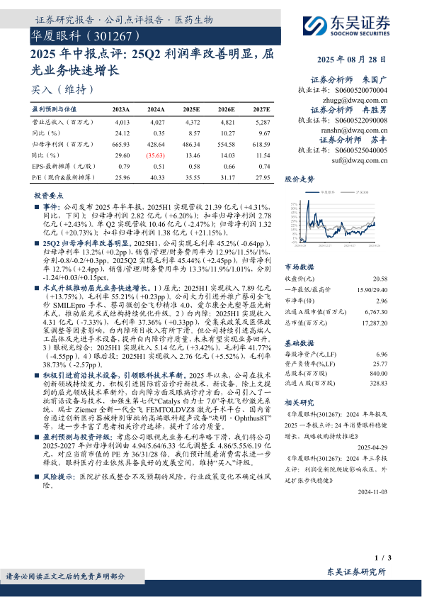 盈利预测与投资评级:考虑公司眼视光业务毛利率略下滑,我们将公司2025-2027年归母净利润由4.94/5.64/6.33亿元调整至4.86/5.55/6.19亿元,对应当前市值的PE为36/31/28倍。我们预计随着消费需求进一步释放,眼科医疗行业依然具备良好的发展空间,维持“买入”评级。