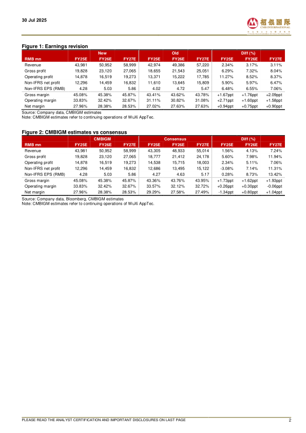 WuXi AppTec reported better-than-expected 1H25 results, with revenueincreasing by 20.6% YoY (including 24.2% YoY growth for continuing operations)and adj. non-IFRS net profit surging by 44.4% YoY. Revenue from continuingoperations and adj. non-IFRS net profit accounted for 47.5% and 54.4%,respectively, of our full-year forecasts, both higher than the historical ranges.WuXi AppTec delivered strong operational execution, despite ongoing macrouncertainties. As such, mgmt. raised its full-year guidance for 2025, expectingrevenue of continuing operations to grow by 13-17% (vs prior guidance of 10-15%) and adj. non-IFRS net profit margin to expand in 2025.