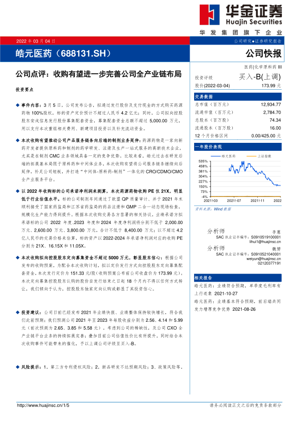 投资建议: 公司日前已经发布 2021 年业绩快报、业绩整体保持较快增长,符合我们此前预期;我们预测公司 2021 年至 2023 年每股收益分别为 2.56、 4.14 和 5.99元(前次预测为 2.65、 3.85 和 5.58 元)。考虑到公司的稀缺性,及公司 CXO 全产业链平台业务的持续拓展完善;叠加目前公司估值性价比有所提升,同时结合本次收购事件可能带来的催化,予以上调公司评级至买入-B。