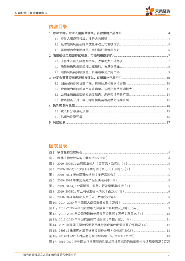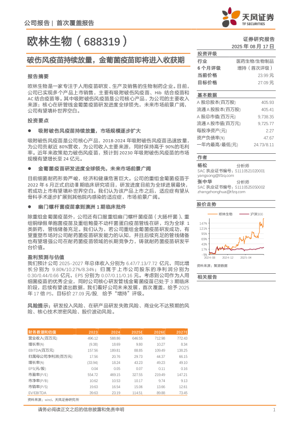 我们预计公司2025-2027年总体收入分别为6.47/7.13/7.72亿元,同比增长分别为9.80%/10.27%/8.34%;归属于上市公司股东的净利润分别为0.30/0.44/0.66亿元,EPS分别为0.07/0.11/0.16元。考虑到公司作为人用细菌疫苗的优秀企业,同时公司核心研发管线金葡菌疫苗已处于3期临床阶段,后续有望读出数据,我们看好公司未来发展,首次覆盖,给予2025年17倍PS,目标价27.09元/股,给予“增持”评级。
