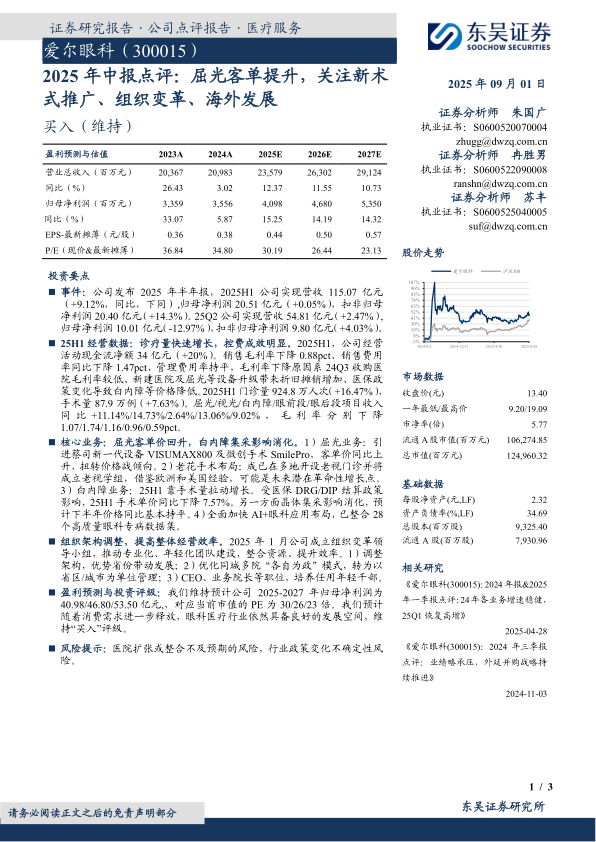本报告对爱尔眼科2025年中报进行了全面分析,公司在营收方面保持稳健增长,并通过技术创新和组织变革积极应对市场变化。屈光业务的客单价提升策略初见成效,老花手术的布局有望成为新的增长点。尽管短期内面临一些挑战,但长期来看,眼科医疗行业仍有良好的发展空间,维持“买入”评级。投资者应关注公司医院扩张、政策变化等风险因素。