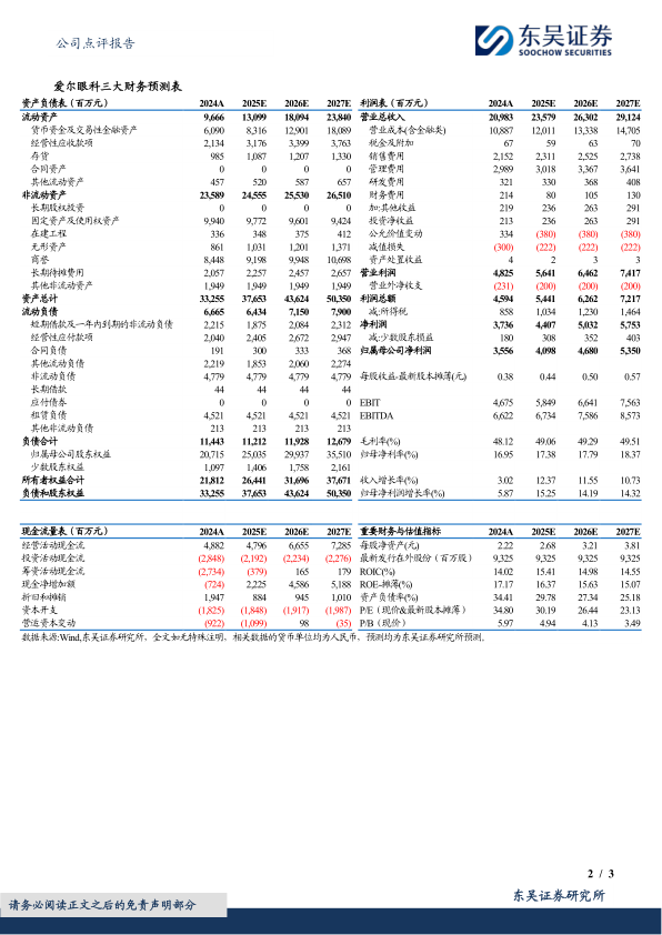 盈利预测与投资评级:我们维持预计公司2025-2027年归母净利润为40.98/46.80/53.50亿元,,对应当前市值的PE为30/26/23倍。我们预计随着消费需求进一步释放,眼科医疗行业依然具备良好的发展空间,维持“买入”评级。