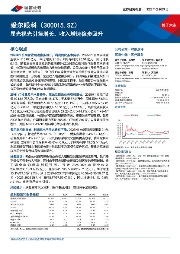 投资建议:考虑公司白内障板块业务收入增速受到集采等因素影响,我们略下调公司营业收入预测;同时由于屈光新设备折旧及新医院的费用摊销,略下调全年归母净利润预测。预计2025-2027年营业收入237.34/268.16/302.22亿元(原为241.70/277.66/317.71亿元),同比增速13.1%/13.0%/12.7%;预计2025-2027年归母净利润40.59/48.30/56.57亿元(2025-2026原为41.35/48.77/57.59亿元),同比增速14.1%/19.0%/17.1%。维持“优于大市”评级。