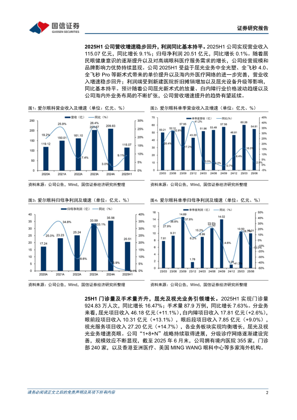 2025H1公司营收增速稳步回升,利润同比基本持平。2025H1公司实现营业收入115.07亿元,同比增长9.1%;归母净利润20.51亿元,同比增长0.1%。随着居民眼健康意识的逐渐提升以及对高端眼科医疗服务需求的增长,公司经营规模和品牌影响力优势持续显现。公司2025H1受益于屈光业务中全光塑、全飞秒4.0、全飞秒Pro等新术式带来的单价提升以及海内外医疗网络的进一步完善,营业收入增速稳步回升;利润端受到新建医院折旧摊销增加以及屈光设备升级等影响,同比基本持平。预计随着公司屈光新术式的放量、白内障行业价格波动趋缓以及公司海内外业务布局的不断扩张,公司营收增速提升的趋势有望延续。
