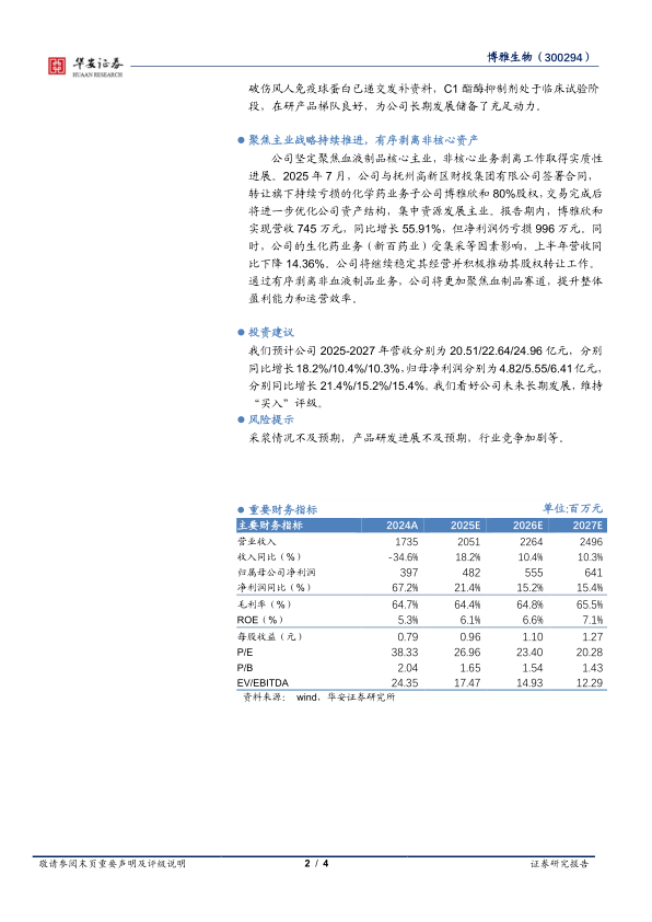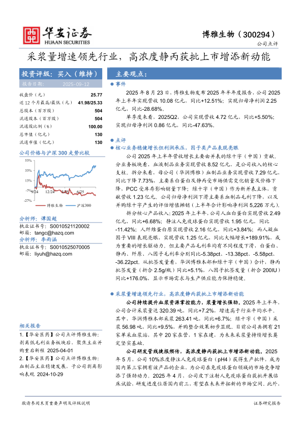 本报告通过对博雅生物2025年中报的分析,突出了公司在采浆量增长、新产品获批以及聚焦主业战略方面的优势。