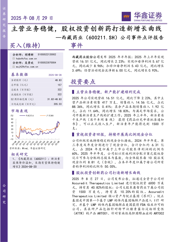 公司事件点评报告:主营业务稳健,股权投资创新药打造新增长曲线