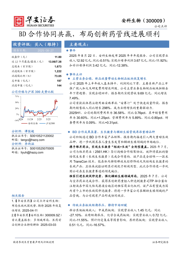公司2025年上半年收入基本持平,利润同比下滑,主要系新产品上市推广投入加大及研发费用增长所致。公司主营业务生物制品板块扭转去年下滑趋势,实现企稳回升,报告期内实现营收9.69亿元,同比增长7.49%。