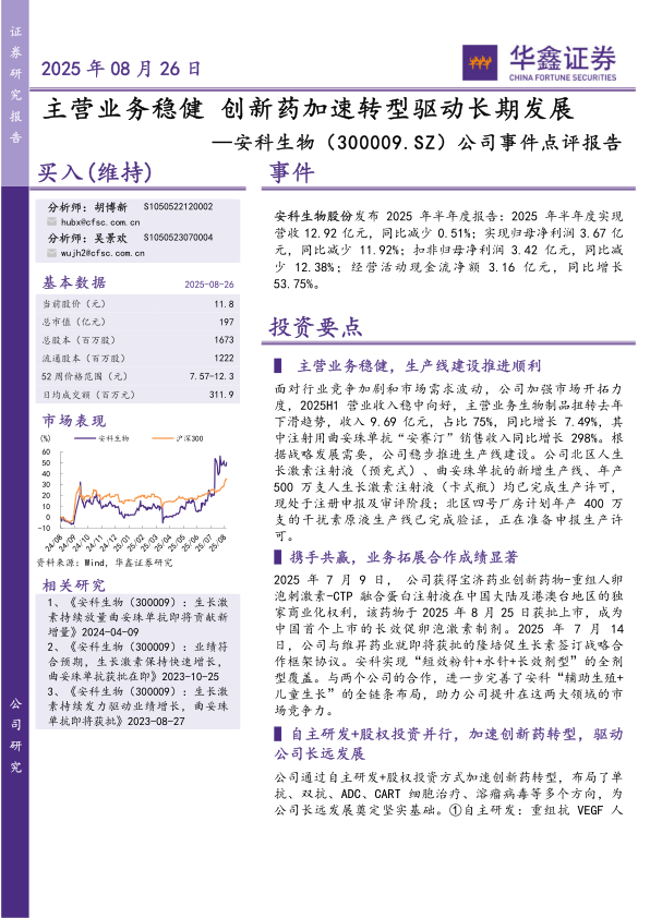 面对行业竞争加剧和市场需求波动,公司加强市场开拓力度,2025H1营业收入稳中向好,主营业务生物制品扭转去年下滑趋势,收入9.69亿元,占比75%,同比增长7.49%,其中注射用曲妥珠单抗“安赛汀”销售收入同比增长298%。根据战略发展需要,公司稳步推进生产线建设。公司北区人生长激素注射液(预充式)、曲妥珠单抗的新增生产线、年产500万支人生长激素注射液(卡式瓶)均已完成生产许可,现处于注册申报及审评阶段;北区四号厂房计划年产400万支的干扰素原液生产线已完成验证,正在准备申报生产许可。