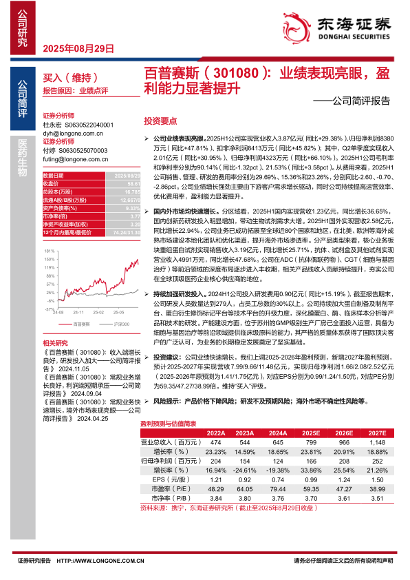 投资建议:公司业绩快速增长,我们上调2025-2026年盈利预测,新增2027年盈利预测,预计2025-2027年实现营收7.99/9.66/11.48亿元,实现归母净利润1.66/2.08/2.52亿元(2025-2026年原预测为1.41/1.75亿元),对应EPS分别为0.99/1.24/1.50元,对应PE分别为59.35/47.27/38.99倍。维持“买入”评级。