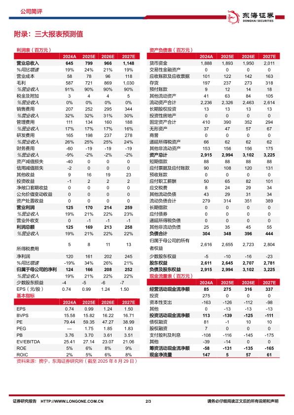 公司业绩表现亮眼。2025H1公司实现营业收入3.87亿元(同比+29.38%)、归母净利润8380万元(同比+47.81%)、扣非净利润8413万元(同比+45.82%);其中,Q2单季度实现收入2.01亿元(同比+30.95%)、归母净利润4323万元(同比+66.10%)。2025H1公司毛利率和净利率分别为90.14%(同比-1.32pct)、21.53%(同比+3.58pct)。从费用来看,2025H1公司销售、管理、研发的费用率分别为29.69%、15.36%和23.26%,分别同比-2.60、-0.7058.61-2.86pct。公司业绩增长强劲主要由下游客户需求增长驱动,同时公司持续提高运营效率16,785优化费用率,盈利能力显著提升。