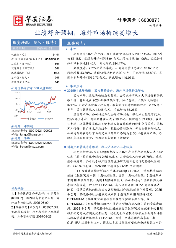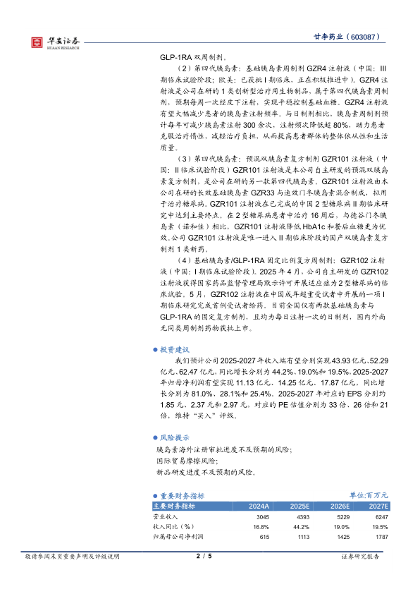 研发创新方面,公司持续加大投入,2025年上半年研发投入达5.52亿元(其中费用化金额约2.65亿元),占营业收入比例26.70%。截至报告披露日,公司处于临床阶段的主要研发项目包括博凡格鲁肽注射液、GZR4注射液、GZR101注射液和GZR102注射液。