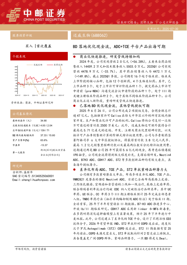 本报告对迈威生物进行了首次覆盖,认为公司通过BD落地优化现金流,ADC+TCE平台产品出海可期。公司商业化快速推进,研发管线持续加码,尤其在ADC和TCE领域差异化布局,ST2单抗具备重磅品种潜力。预计公司未来营收将快速增长,首次覆盖给予“买入”评级,但同时也提示了创新药研发、市场竞争和技术迭代等风险。