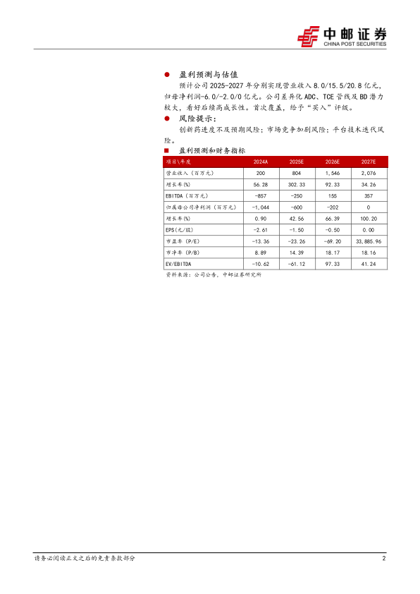 预计公司 2025-2027 年分别实现营业收入 8.0/15.5/20.8 亿元,归母净利润-6.0/-2.0/0 亿元。 公司差异化 ADC、 TCE 管线及 BD 潜力较大, 看好后续高成长性。 首次覆盖, 给予“买入” 评级。