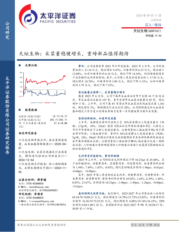截至2025年6月末,公司下属单采血浆站分布于全国16个省/自治区,单采血浆站总数达107家,其中在营单采血浆站数量达85家,同比增加5家。上半年,公司下属85家营业单采血浆站实现血浆采集1,361吨,同比增长5%,保持国内行业占比约20%。公司持续通过加大血源发展和稳定工作力度以及绩效考核力度等一系列措施努力提升采浆量。
