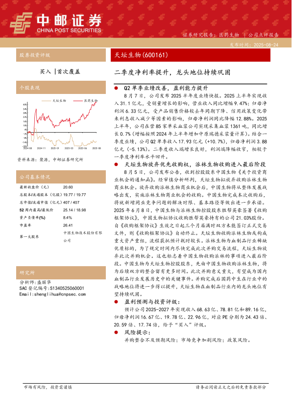 本报告分析了天坛生物2025年上半年的业绩表现,指出公司二季度业绩有所改善,盈利能力提升。同时,公司放弃优先收购权,为控股股东收购派林生物铺平道路,有望巩固其在血制品行业的龙头地位。报告还对公司未来几年的收入和利润进行了预测,并给出了“买入”评级,但也提示了并购整合、市场竞争和政策等风险。