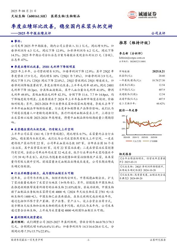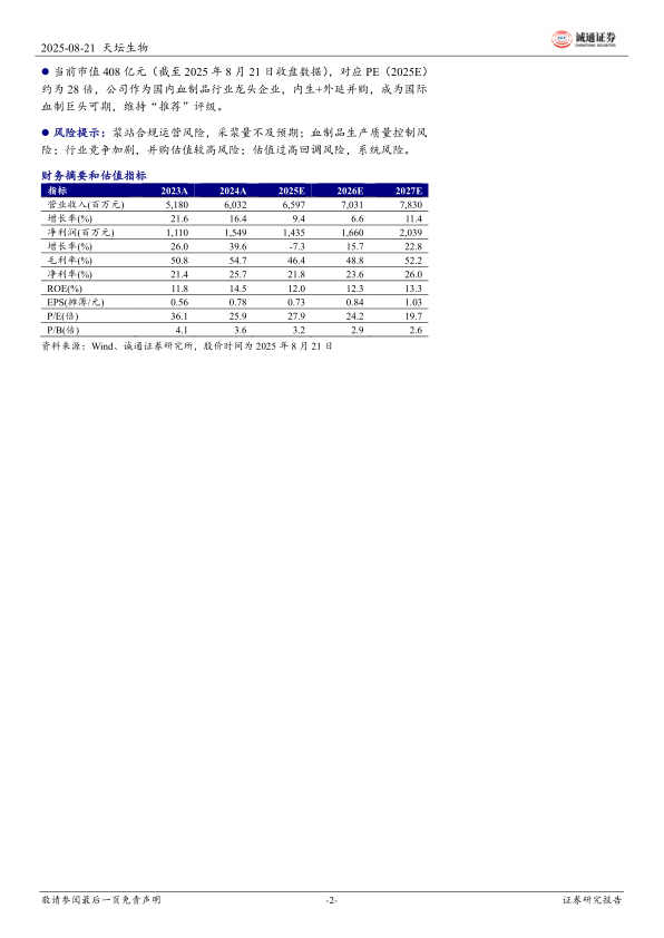 当前市值408亿元(截至2025年8月21日收盘数据),对应PE(2025E)约为28倍,公司作为国内血制品行业龙头企业,内生+外延并购,成为国际血制巨头可期,维持“推荐”评级。