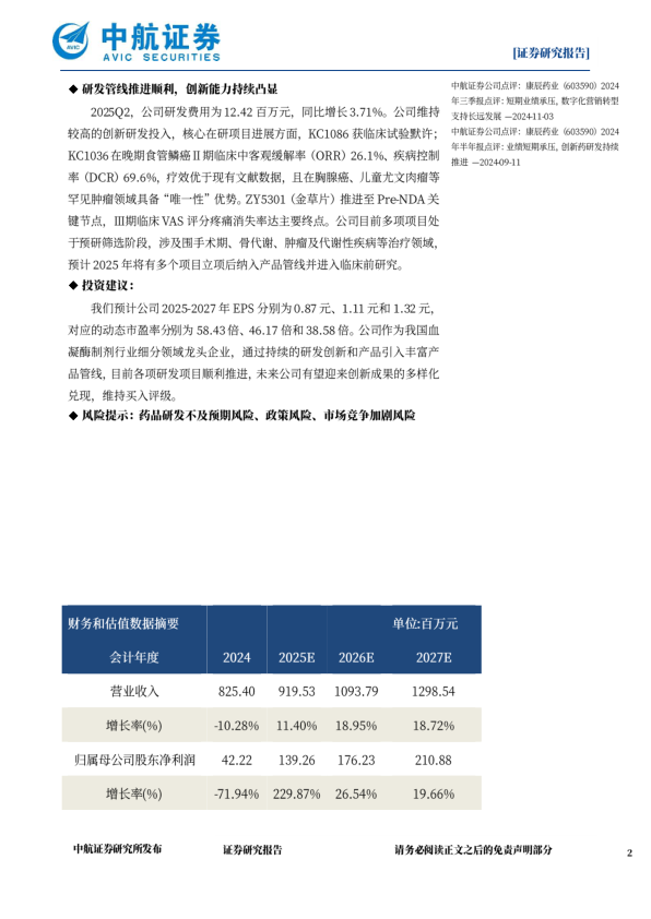 我们预计公司2025-2027年EPS分别为0.87元、1.11元和1.32元,对应的动态市盈率分别为58.43倍、46.17倍和38.58倍。公司作为我国血凝酶制剂行业细分领域龙头企业,通过持续的研发创新和产品引入丰富产品管线,目前各项研发项目顺利推进,未来公司有望迎来创新成果的多样化兑现,维持买入评级。