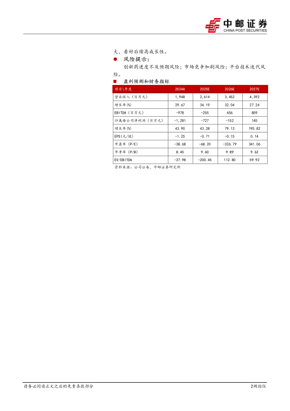 预计公司 2025-2027 年分别实现营业收入 26.1/34.5/43.9 亿元,归母净利润-7.3/-1.5/1.5 亿元。 公司商业化稳步推进及 BD 潜力较大, 看好后续高成长性。