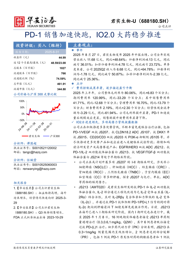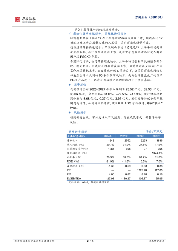 本报告对君实生物2025年中报业绩进行了深入分析,核心观点如下:
