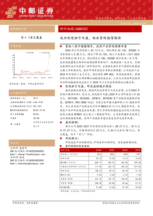2024 年公司实现收入 25.13 亿元, 同比增长 33.13%, 2025Q1 公司实现收入 5.20 亿元, 同比下降 15.15%。 核心产品重组八因子 2024全年销售达 18.9 亿元, 同比增长 6.18%, 2025Q1 预计出现一定下滑,在区域联盟集采降价和医保控费等影响下, 短期面临一定压力, 长期来看预防治疗仍具备广阔市场空间。 安佳因在海外多个国家积极推进注册上市和商业化, 海外市场有望逐步贡献业绩增量。 公司抗体产品2024 年实现收入 6.2 亿元, 同比增长 499.80%, 实现快速增长。 菲诺利单抗单药针对头颈部鳞状细胞癌的适应症, 以及与贝伐珠单抗联用针对肝细胞癌的适应症已于 2025 年 2 月先后取得药品注册证书。