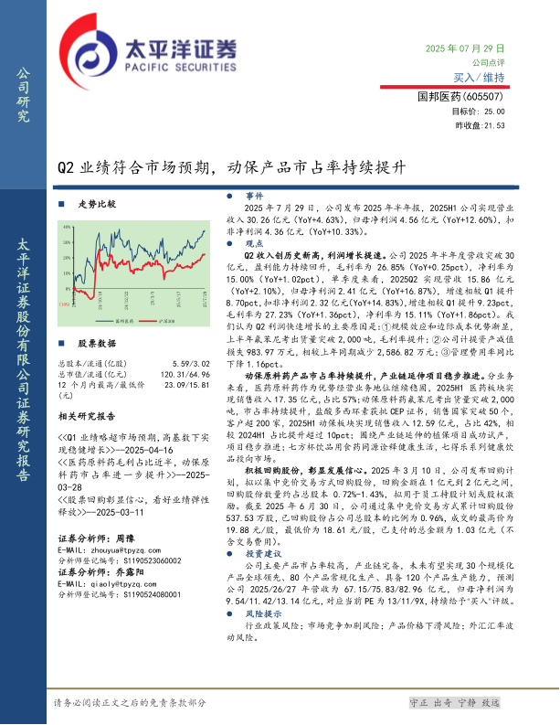 本报告对国邦医药2025年半年度报告进行了深入分析,认为公司Q2业绩表现亮眼,收入和利润均实现增长,动保业务市占率持续提升,产业链延伸项目稳步推进。公司积极回购股份,彰显发展信心。维持“买入”评级,并预测公司未来营收和净利润将持续增长。同时,报告也提示了行业政策、市场竞争、产品价格和外汇汇率等风险。
