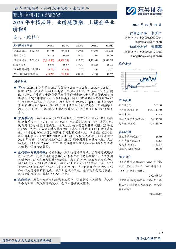 事件:2025H1公司营收24.3亿美金(25Q1=11.2亿,25Q2=13.2亿),同比+42%,产品收入24.1亿美金(25Q1=11.1亿,25Q2=13.0亿),同比+43.8%。主要得益于泽布替尼在美国的领先地位和在欧洲等地销售持续增长。25Q2泽布替尼收入9.7亿美金,同比+53%(环比+23%),GAAP口径毛利率87.4%(+2.4pct),研发费用率39.8%(-9pct),销售及管理费用率41%(-16pct),GAAP口径持续盈利0.94亿美金,经调整净利润2.53亿美金。上调2025年收入指引50-53亿美金(前值49-53亿美金)。