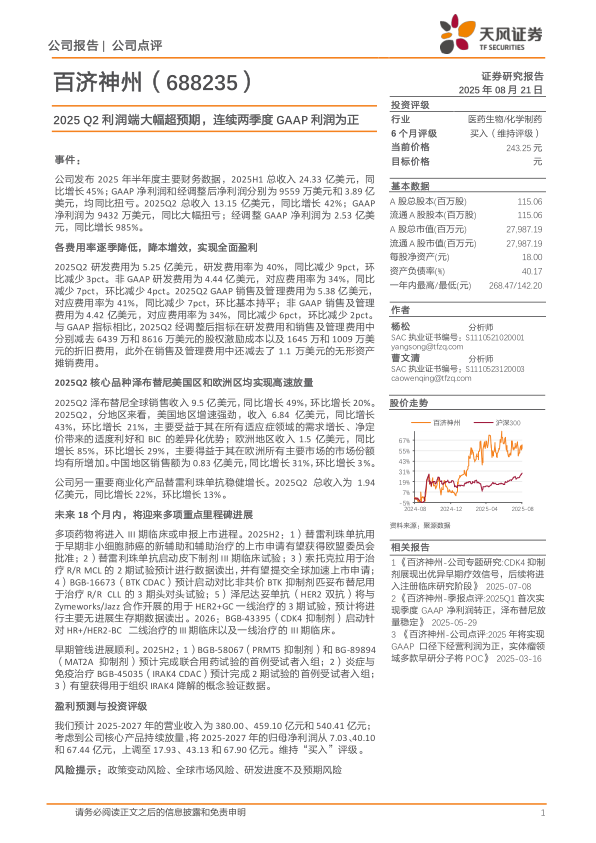 早期管线进展顺利。2025H2:1)BGB-58067(PRMT5抑制剂)和BG-89894(MAT2A抑制剂)预计完成联合用药试验的首例受试者入组;2)炎症与免疫治疗BGB-45035(IRAK4CDAC)预计完成2期试验的首例受试者入组;3)有望获得用于组织IRAK4降解的概念验证数据。