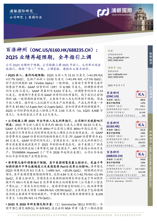 本报告分析了百济神州2Q25的业绩表现,指出公司业绩超出预期,并上调了全年指引。泽布替尼海外销售的强劲增长是主要驱动力,公司丰富的研发管线也为未来增长提供了动力。维持“买入”评级,并上调了美股、港股和A股的目标价。同时,报告也提示了投资者需要关注的销售、研发和地缘政治风险。