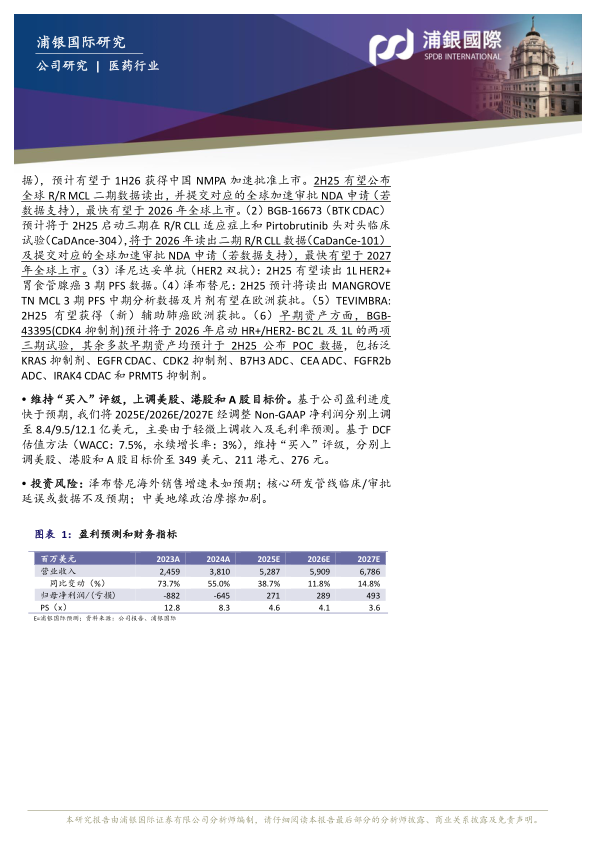 2H25及2026年研发催化剂丰富:(1)Sonrotoclax(BCL2抑制剂):目前中国已递交R/R CLL和R/R MCL适应症的NDA申请(基于二期试验数据),预计有望于1H26获得中国NMPA加速批准上市。2H25有望公布全球R/R MCL二期数据读出,并提交对应的全球加速审批NDA申请(若数据支持),最快有望于2026年全球上市。(2)BGB-16673(BTK CDAC)预计将于2H25启动三期在R/R CLL适应症上和Pirtobrutinib头对头临床试验(CaDAnce-304),将于2026年读出二期R/R CLL数据(CaDanCe-101)及提交对应的全球加速审批NDA申请(若数据支持),最快有望于2027年全球上市。(3)泽尼达妥单抗(HER2双抗):2H25有望读出1L HER2+胃食管腺癌3期PFS数据。(4)泽布替尼:2H25预计将读出MANGROVETN MCL3期PFS中期分析数据及片剂有望在欧洲获批。(5)TEVIMBRA:2H25有望获得(新)辅助肺癌欧洲获批。(6)早期资产方面,BGB-43395(CDK4抑制剂)预计将于2026年启动HR+/HER2-BC2L及1L的两项三期试验,其余多款早期资产均预计于2H25公布POC数据,包括泛KRAS抑制剂、EGFR CDAC、CDK2抑制剂、B7H3ADC、CEA ADC、FGFR2bADC、IRAK4CDAC和PRMT5抑制剂。