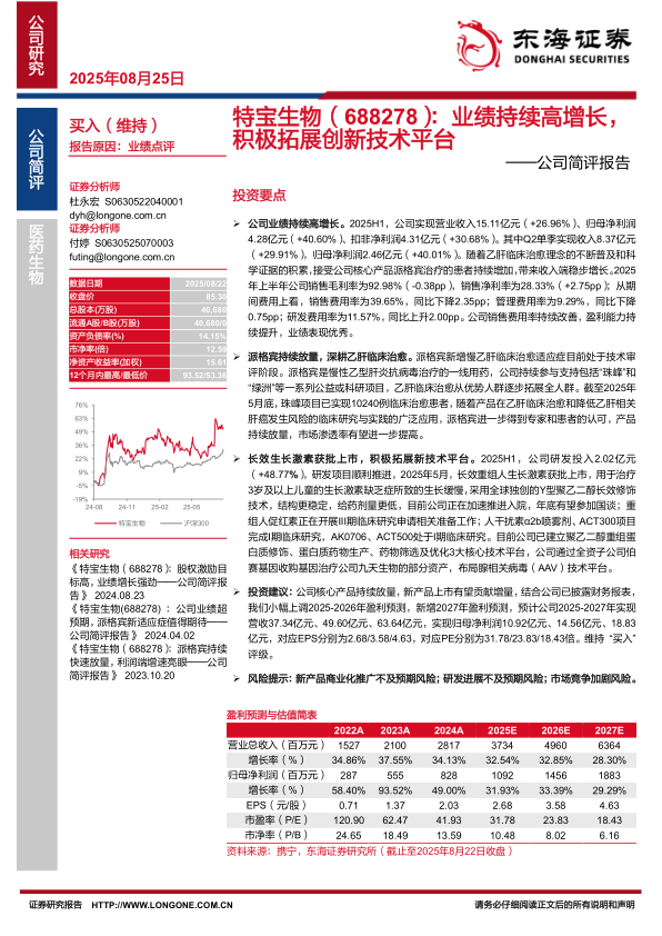本报告分析了特宝生物2025年上半年的业绩表现,指出公司业绩持续高增长,盈利能力显著提升。核心产品派格宾持续放量,市场渗透率有望进一步提高。同时,长效生长激素获批上市,公司积极拓展新技术平台。报告上调了公司未来几年的盈利预测,维持“买入”评级。