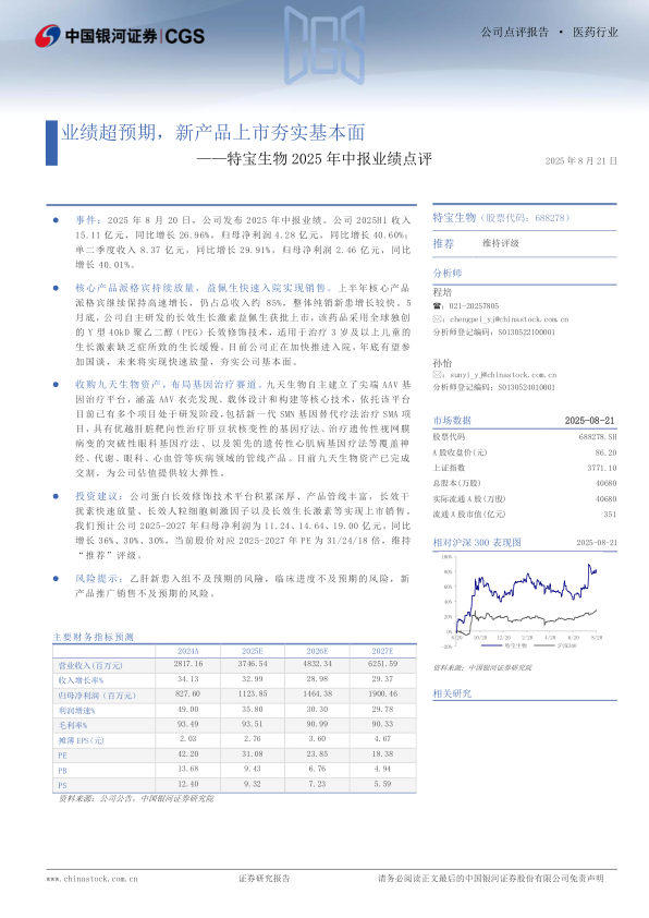 本报告分析了特宝生物2025年中报业绩,指出公司业绩超预期增长主要受益于核心产品派格宾的持续放量和新产品益佩生的快速入院。同时,公司通过收购九天生物资产,积极布局基因治疗赛道,有望为未来发展带来新的增长点。维持“推荐”评级,但需关注乙肝新患入组、临床进度以及新产品推广销售等方面的风险。