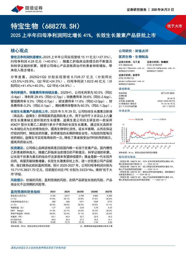 投资建议:公司核心品种派格宾是目前国内唯一长效干扰素产品,国内慢性乙肝患者群体庞大,随着乙肝临床治愈理念的不断普及、科学证据的积累,以长效干扰素为基石的组合疗法渗透率有望持续提升;珮金是新一代长效升白药,有望贡献销售增量;长效生长激素获批上市,进一步完善公司产品矩阵。我们维持此前的盈利预测,预计2025-2027年,公司归母净利润分别为10.71/15.38/21.70亿元,目前股价对应PE分别为33/23/16x,维持“优于大市”评级。