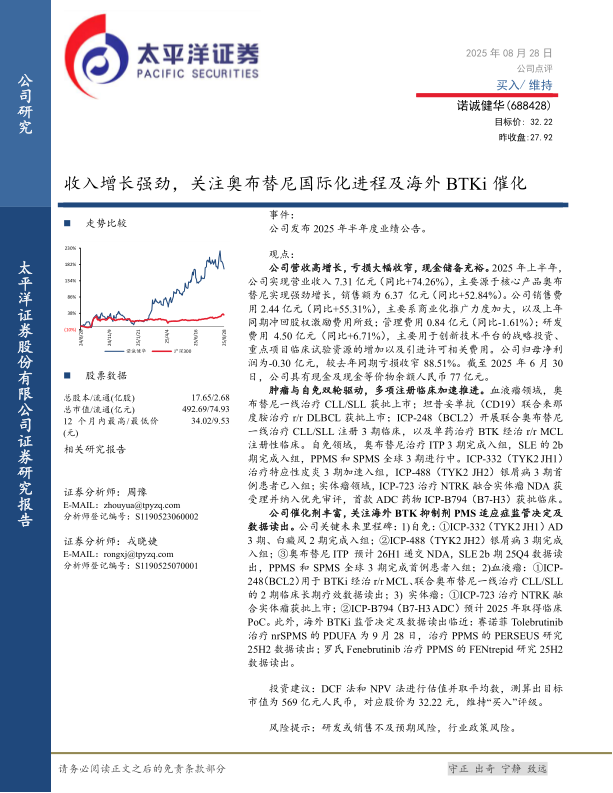 公司催化剂丰富,关注海外BTK抑制剂PMS适应症监管决定及数据读出。公司关键未来里程碑:1)自免:①ICP-332(TYK2JH1)AD3期、白癜风2期完成入组;②ICP-488(TYK2JH2)银屑病3期完成入组;③奥布替尼ITP预计26H1递交NDA,SLE2b期25Q4数据读出,PPMS和SPMS全球3期完成首例患者入组;2)血液瘤:①ICP-248(BCL2)用于BTKi经治r/r MCL、联合奥布替尼一线治疗CLL/SLL的2期临床长期疗效数据读出;3)实体瘤:①ICP-723治疗NTRK融合实体瘤获批上市;②ICP-B794(B7-H3ADC)预计2025年取得临床PoC。此外,海外BTKi监管决定及数据读出临近:赛诺菲Tolebrutinib治疗nrSPMS的PDUFA为9月28日,治疗PPMS的PERSEUS研究25H2数据读出;罗氏Fenebrutinib治疗PPMS的FENtrepid研究25H2数据读出。