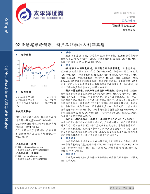 新产品持续放量,法规市场注册获批持续进行。分业务来看,2025H1原料药及中间体业务实现营收3.95亿元(YoY+15.48%),毛利率为31.56%,同比-3.17pct,一方面,行业竞争加剧,部分产品价格承压,另一方面,原料药新产品持续放量,且产品注册获批持续进行,年初至今,维格列汀在国内完成注册,塞来昔布(工艺Ⅱ)获得欧洲药典适应性证书,米拉贝隆、恩格列净、美阿沙坦钾、甲苯磺酸艾多沙班、阿戈美拉汀、奥吡卡朋陆续获得韩国药品注册证书,法规市场销售有望持续推进;CMO/CDMO业务实现营收0.32亿元(YoY-19.05%),毛利率为30.08%,同比-2.67pct,主要由于个别订单终止执行。