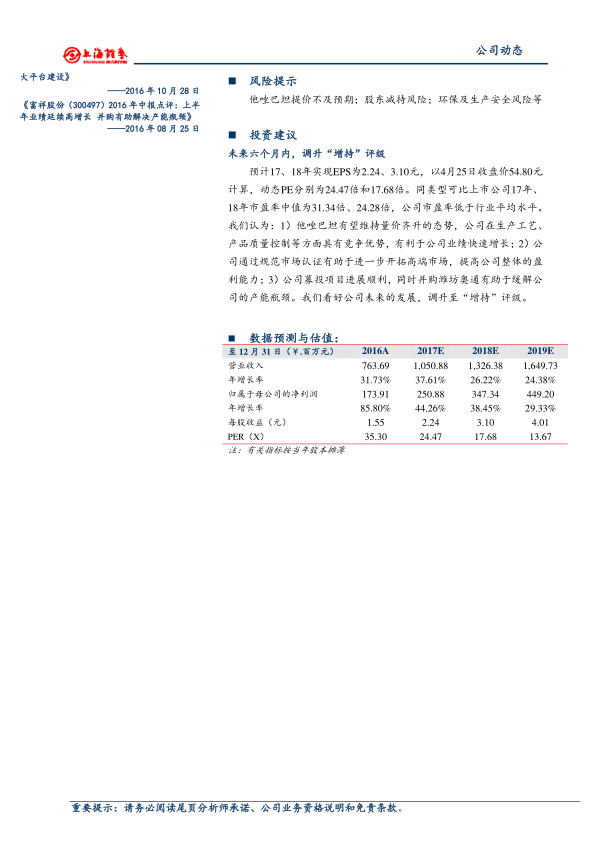 基于公司良好的发展态势和未来增长潜力,上海证券研究所将富祥股份的投资评级调升至“增持”。这一评级调整是基于对公司产品竞争优势、市场开拓能力以及产能瓶颈缓解等因素的综合考量。