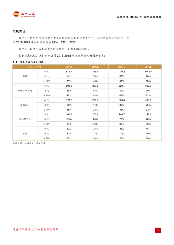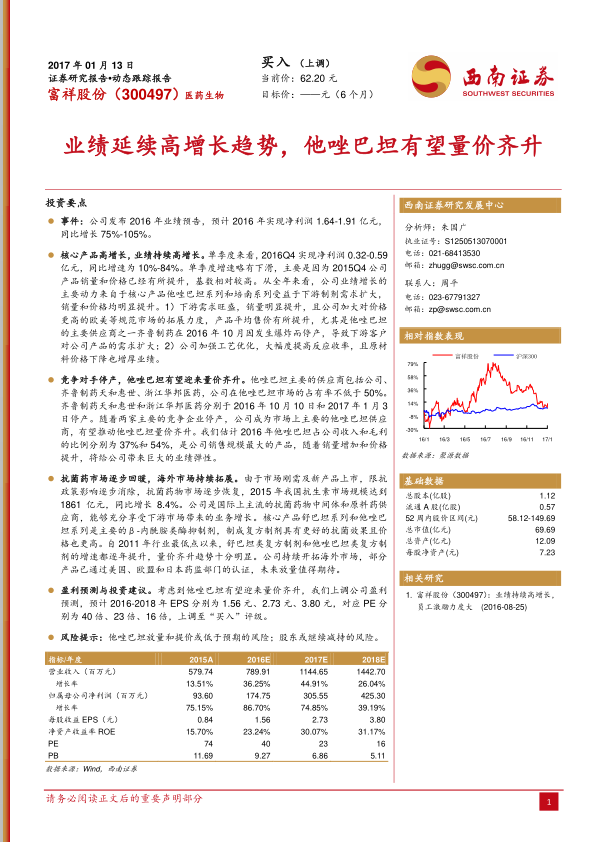 本报告分析了富祥股份2016年业绩预告,指出公司业绩增长主要受益于核心产品他唑巴坦和培南系列量价齐升。竞争对手停产为公司带来他唑巴坦量价齐升的机遇。抗菌药市场回暖和海外市场拓展也为公司发展提供动力。上调公司盈利预测和投资评级,但同时提示了相关风险。
