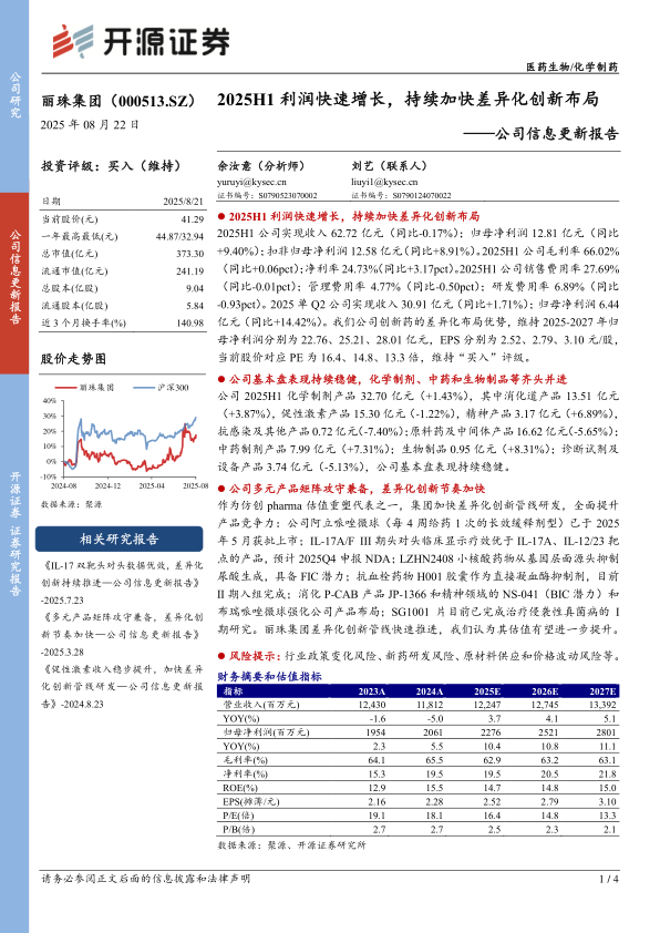 2025H1公司实现收入62.72亿元(同比-0.17%);归母净利润12.81亿元(同比+9.40%);扣非归母净利润12.58亿元(同比+8.91%)。2025H1公司毛利率66.02%(同比+0.06pct);净利率24.73%(同比+3.17pct)。2025H1公司销售费用率27.69%(同比-0.01pct);管理费用率4.77%(同比-0.50pct);研发费用率6.89%(同比-0.93pct)。2025单Q2公司实现收入30.91亿元(同比+1.71%);归母净利润6.44亿元(同比+14.42%)。我们公司创新药的差异化布局优势,维持2025-2027年归母净利润分别为22.76、25.21、28.01亿元,EPS分别为2.52、2.79、3.10元/股,当前股价对应PE为16.4、14.8、13.3倍,维持“买入”评级。