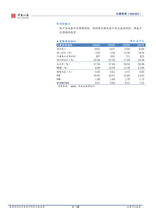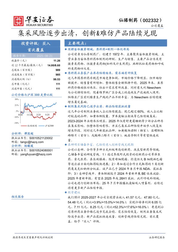 我们预计2025-2027年公司实现营业收入41.57亿元、47.80亿元、54.48亿元(同比+3.9%/+15.0%/+14.0%);实现归母净利润6.05亿元、7.11亿元、8.25亿元(同比+52.3%/+17.6%/+16.0%)。考虑到公司原料药业务价格已逐步见底企稳,需求陆续恢复,制剂业务集采风险逐步出清,新产品获批快速放量,创新管线将陆续兑现。首次覆盖,给予“买入”评级。