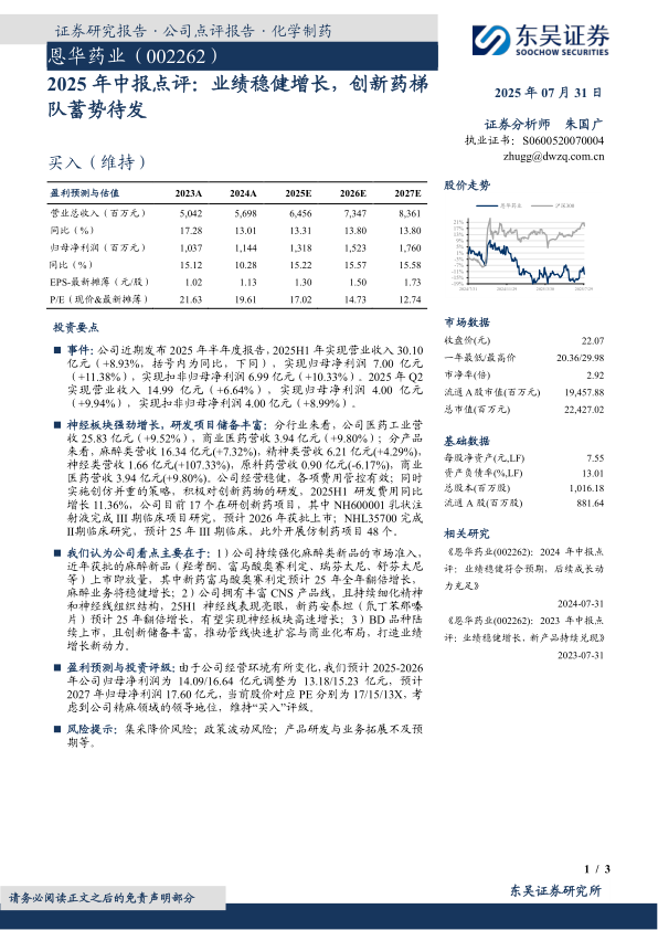 我们认为公司看点主要在于:1)公司持续强化麻醉类新品的市场准入,近年获批的麻醉新品(羟考酮、富马酸奥赛利定、瑞芬太尼、舒芬太尼等)上市即放量,其中新药富马酸奥赛利定预计25年全年翻倍增长,麻醉业务将稳健增长;2)公司拥有丰富CNS产品线,且持续细化精神和神经线组织结构,25H1神经线表现亮眼,新药安泰坦(氘丁苯那嗪片)预计25年翻倍增长,有望实现神经板块高速增长;3)BD品种陆续上市,且创新储备丰富,推动管线快速扩容与商业化布局,打造业绩增长新动力。