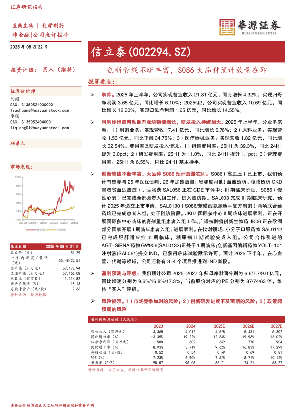 基于公司稳健的业绩增长和创新管线的积极进展,华源证券维持信立泰“买入”评级,并预测公司未来几年归母净利润将保持稳定增长。