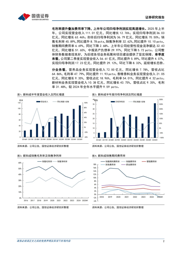 毛利率提升叠加费用率下降,上半年公司归母净利润实现高速增长。上半年,公司实现营业收入111.01亿元,同比增长12.76%;实现归母净利润36.03亿元,同比增长63.46%;销售毛利率45.89%,同比提升8.78pcts,销售净利率32.62%,同比提升10.10pcts,销售期间费用率6.69%,同比下降2.68%。公司第二季度实现营业收入56.61亿元,同比提升5.89%,环比提升4.07%,实现归母净利润17.23亿元,同比提升29.12%,环比下降8.32%,延续增长态势。分业务看,营养品业务实现营业收入72.00亿元,同比增长7.78%,营收占比64.86%,毛利率47.79%,同比提升11.93pcts;香精香料业务实现营业收入21.05亿元,同比增长9.35%,营收占比18.96%,毛利率54.01%,同比提升4.32pcts;新材料业务实现营业收入10.38亿元,同比增长43.75%,营收占比9.35%,毛利率31.48%,较2024年全年水平提升9.59pcts。