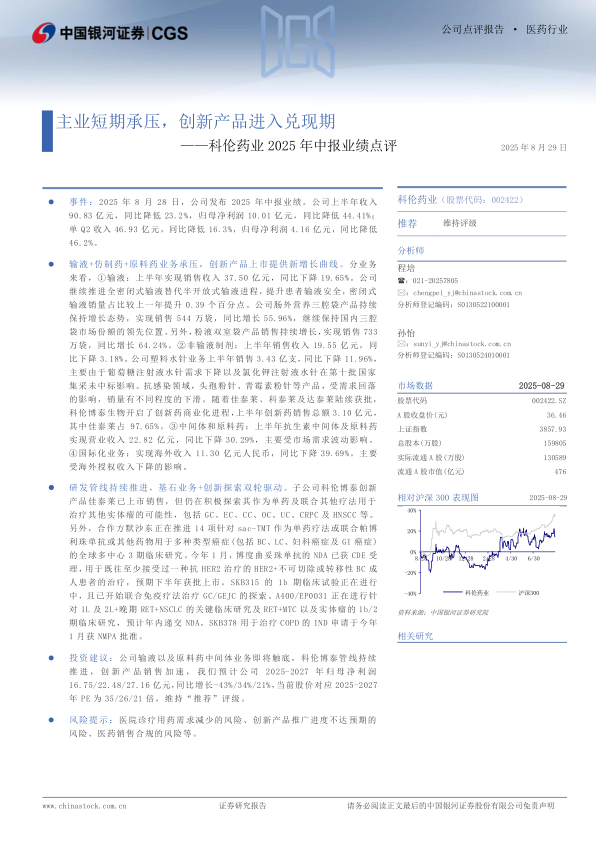 科伦药业2025年中报业绩点评:主业短期承压,创新产品进入兑现期