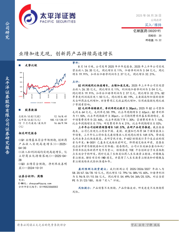 Q2利润端同比快速增长,业绩加速兑现。2025年上半年公司实现营业收入26.35亿元,同比增长0.11%,利润端归母净利润为3.04亿元,同比增长19.91%,扣非后归母净利润为2.37亿元,同比增长32.21%。Q2单季度利润端实现1.50亿元,同比增长40.19%,主要因高附加值的创新及自研药品毛利增加、财务费用汇兑收益同比增加、信用减值损失同比减少等因素影响。