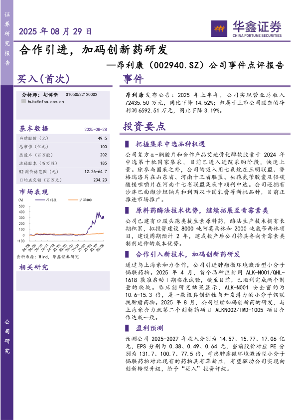 预测公司2025-2027年收入分别为14.57、15.77、17.06亿元,EPS分别为0.38、0.49、0.64元,当前股价对应PE分别为131.7、100.7、77.5倍,考虑肿瘤微环境激活型小分子偶联药物对比现有的药物具有革新性,有望驱动公司实现向创新转型升级,给予“买入”投资评级。