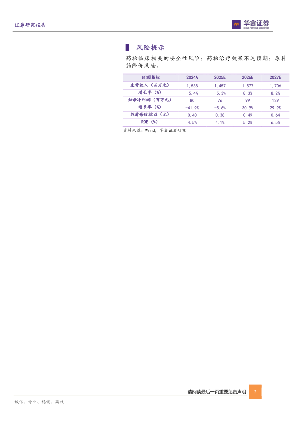 风险提示 药物临床相关的安全性风险;药物治疗效果不达预期;原料药降价风险。