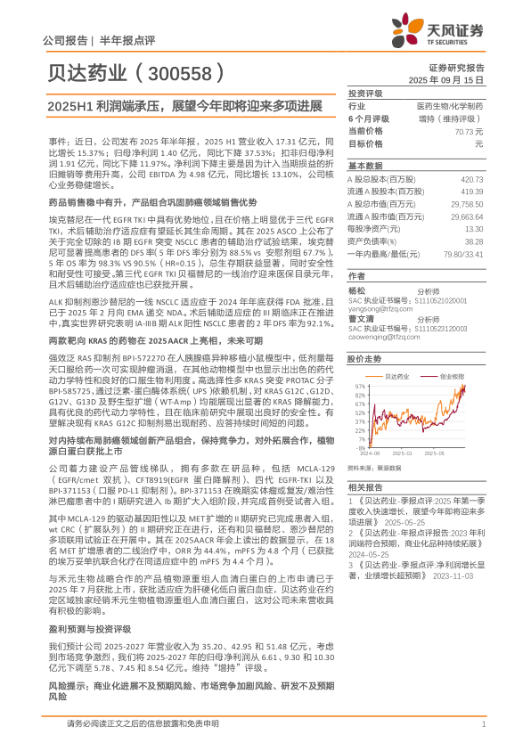 贝达药业2025年上半年业绩虽受费用影响利润承压,但核心业务保持稳健增长。公司在肺癌治疗领域的产品组合优势明显,新产品的研发和对外合作也在积极推进。维持“增持”评级,但需关注商业化进展、市场竞争和研发风险。